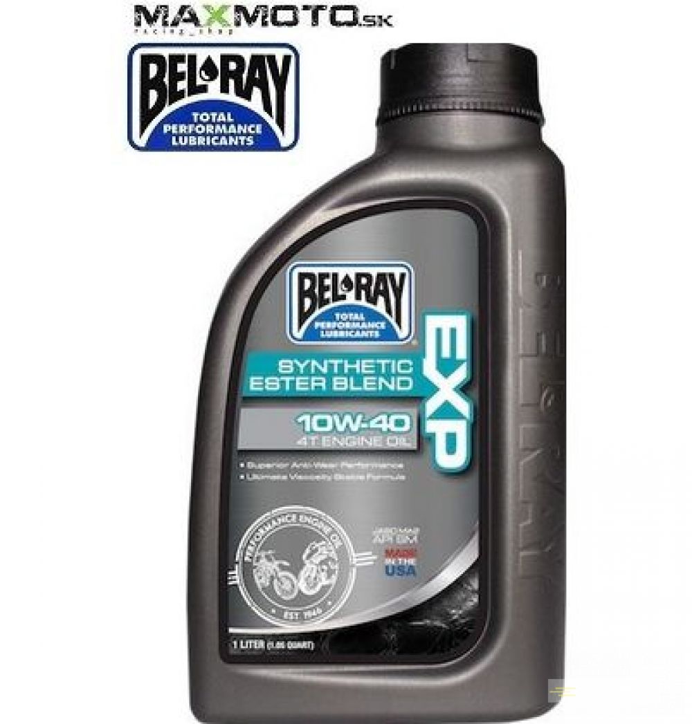 Bel-Ray ® EXP Synthetic Ester Blend 4T Engine Oil je syntetický olej, ktorý obsahuje kombináciu najkvalitnejších syntetických olejov s vybranými minerálnymi základovými olejmi a zabezpečuje najvyššiu úroveň ochrany pre všetky štvortaktné motocyklové motory. Obsahuje aditíva pre zvýšenú odolnosť voči strihovému zaťaženiu. Spĺňa výkonnostné požiadavky noriem API SM a JASO MA2. Je vhodný pre všetky vzduchom i kvapalinou chladené štvortaktné motory motocyklov a pre spojky pracujúce v olejovom kúpeli.