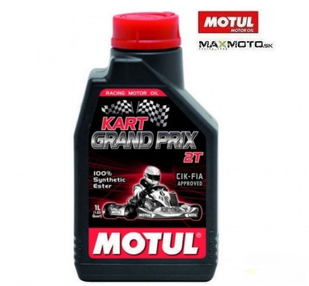 Motorový olej MOTUL pre všetky 2T motory - plne syntetický olej esterovou syntézou - pre súťaže motokár - označené karting 20 000 otáčok/min, určený pre mazanie zmesou paliva a oleja. Motorový olej Motul KART GRAND PRIX je vyrábaný na báze rastlinných, biologicky odúrateľných surovín - vynikajúce mazacie vlastnosti vo veľmi vysokých otáčkach - zvyšuje výkon motora, redukuje tvorbu usadenín, zabraňuje zanášaniu výfukových kanálov.